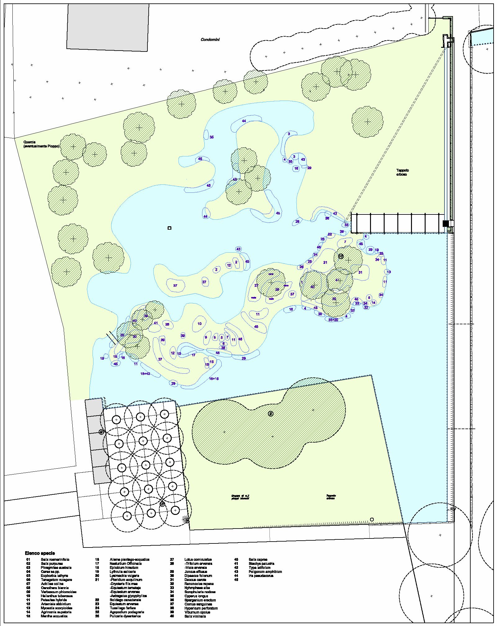 - Elenco delle specie vegetali ripopolate Salix rosmarinifolia, Salix purpurea, Phragmites australis, Carex ss.pp., Euphorbia lathyris, Tanacetum vulgare, Achillea collina, Oenothera biennis, Verbascum phlomoides , Helianthus tuberosus , Petasites hybridus, Artemisia absinthium, Myosotis scorpioides , Agrimonia eupatoria , Mentha aquatica, Alisma plantago-aquatica, Nasturtium officinalis, Epilobium hirsutum, Lythrum salicaria, Lysimachia vulgaris, Astragalus glycyphyllos, Dryopteris filix-mas, Equisetum arvense, Equisetum telmateja, Pteridium aquilinum, Solidago canadensis, Equisetum arvense, Tussillago farfara, Aegopodium podagraria, Pulicaria dysenterica, Lotus corniculatus, Viola arvensis, Trifolium arvense, Juncus effusus, Dipsacus fullonum, Daucus carota, Ranunculus repens, Nymphaea alba, Scrophularia nodosa, Cyperus longus, Sparganium erectum, Cornus sanguinea, Hypericum perforatum, Viburnum opulus, Salix viminalis, Salix caprea, Stachys palustris, Typha latifolia, Polygonum amphibium, Iris pseudacorus,